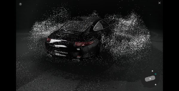 一つ目のデモは、新しいポルシェの黒光りするボディに、美しいライティング効果と流体パーティクルの映り込みを適用したデモです。