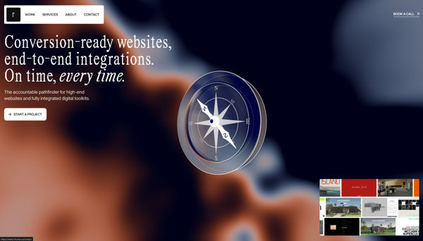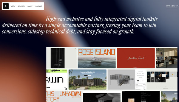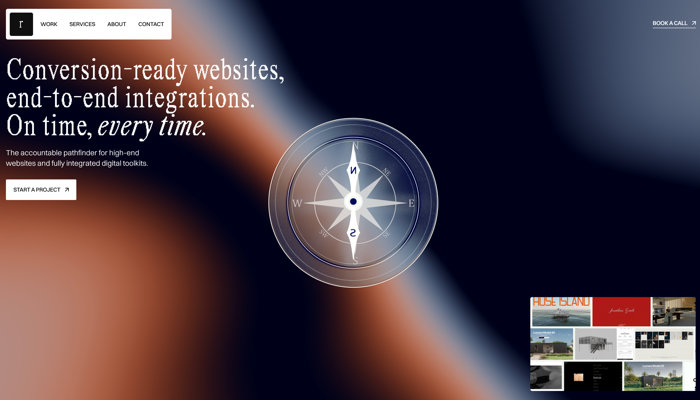 シンプルなシェーダによる背景表現がスマートな雰囲気を演出する Rhumb Studio のウェブサイト