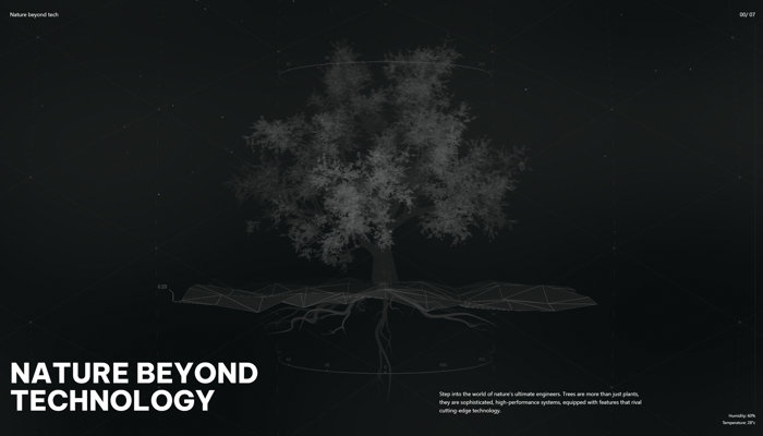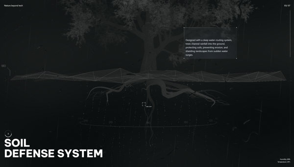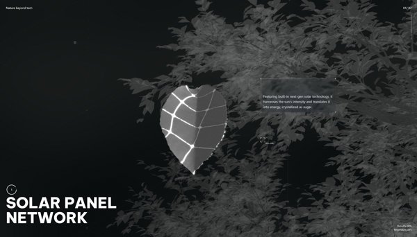 この上のスクリーンショットを見ると「SOLAR PANEL NETWORK」と書かれている部分がありますが、こんなふうに自然界の樹木が持つ機構や能力を、人間の技術に当てはめるような感じで説明が重ねられていきます。